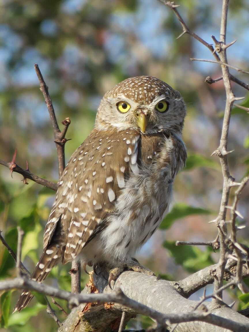 Small in size but full of character as a pearl spotted owlet perches on a branch with piercing yellow eyes scanning its surroundings. A picture-perfect portrait.