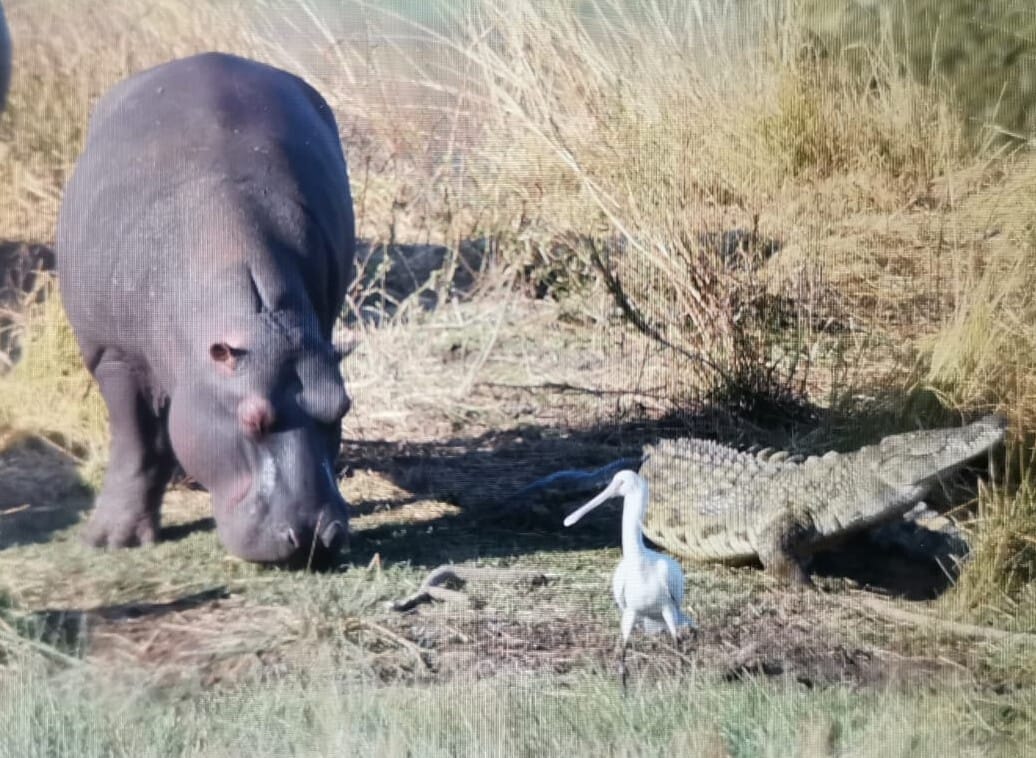 A hippo, crocodile, and spoonbill share the riverbank in a rare moment of calm where three very different species cross paths in the wild.
