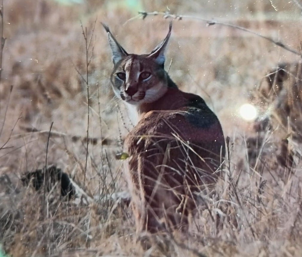 With pointed ears standing alert, a striking caracal glances back, its posture full of intensity and grace.