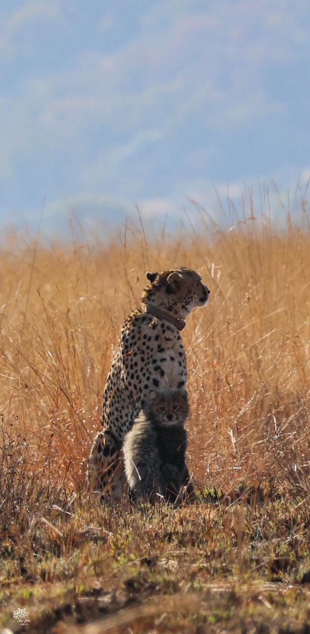 Nothing like a mother’s love for her baby. A cheetah cub presses close to its mom for comfort and protection as she scouts the land beyond for any signs of danger.