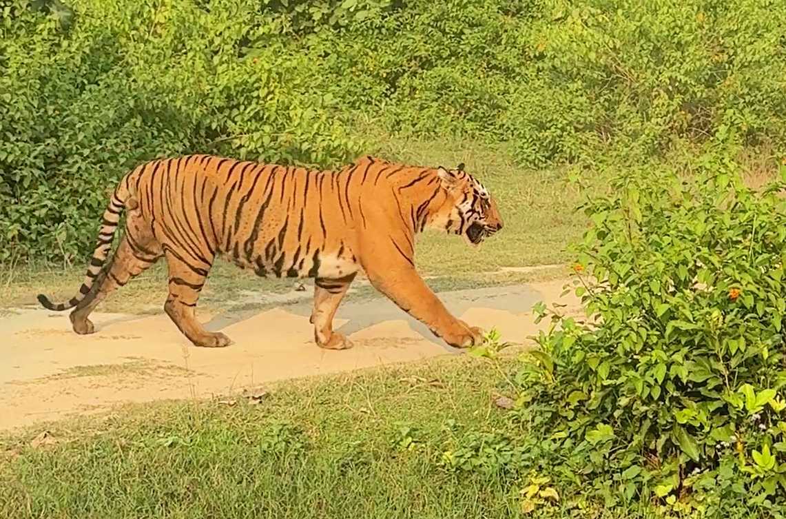 A tiger by the name of Bhola surprised visitors in India on an unnamed road as it travelled across the dirt road and vanished into the greens. What a beautiful sighting to witness!