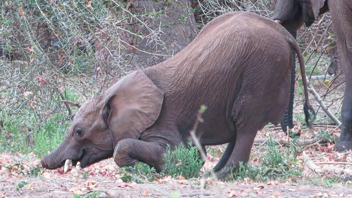Young Elephant Without Trunk Seen Kneeling to Eat Near Crooks’ Corner