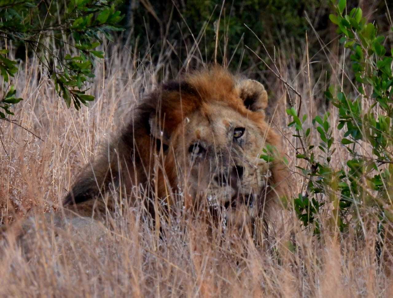 Male lions spend up to 20 hours a day resting, conserving their energy for hunting or defending their territory. This stationary lion was sighted on the S28 and eventually moved on west.